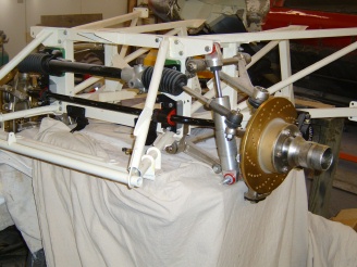 The first step in assembling the front suspension is to mount the “hard points” onto the picture frame/engine frame combination. These pieces transition from the sheet metal of the frames to the solid pieces of the suspension. Once the hard points are mounted, the upper and lower A-arms can be mounted. The A-arms articulate via rubber bushings. The bushings are ultimately clamped into a fixed position but should be left unclamped until the car is complete, standing on its tires, and loaded to a normal operating weight. In this “mid-laden” position, the rubber bushings are tightened. At this point, any suspension movement up or down twists the rubber of the bushing. If you do not get the bushings set at the proper neutral position, the twisting movement could be too great and cause them to tear.