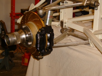 Once I got the A-arms mounted, they were connected to the upright via ball joints. The original equipment ball joints were overly complicated, with springs and shims. A newer style is available for the lower ball joint that is all one piece and sealed as one unit. I understand it showed up with the XJ-6 and is backwards compatible with the E-type. Unfortunately, a one piece upper ball joint is not available. So I carefully assembled the various springs and shims per the shop manual. Once the upright is assembled, the axle stubshaft can be inserted and the inner and outer bearings can be mounted onto the shaft and into the splined wheel hub. Once again, the inetogether web site was invaluable in helping with this step. Prior to mounting the wheel hub, I pulled out the very trick cross drilled and vented brake rotors that I had purchased several years ago from http://www.classicjaguar.com. These are quite the eye candy! They will probably only marginally improve the braking but they will look great peaking through the wire wheels! I also took this chance to mount my billet Wilwood disc brake calipers, also purchased from Classic Jaguar. More eye candy but in this case I hope to realize some nice improvement in the braking department from these babies. At this point they are just mounted into position. The installation of the hydrualic lines and addition of brake fluid will come much later.
