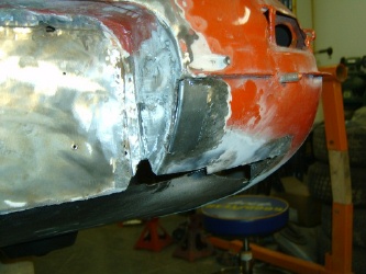 At least on the 2+2, it appears that the floor sheetmetal is adjoined around it perimeter with overlapping seams that are copiously spot welded. But it is a seam that can logically be separated in preparation for the new piece. I proceeded to first cut out the old floorboard one or two inches inboard of its edge with my grinding disk. This got the bulk of the old floor out of the way, giving me better access to the critical seam. Next came the tedious part, that being the drilling out of dozens of spot welds placed around the perimeter. One trick is to work the seam with your wire wheel, removing the undercoating and paint. The spot weld tends to be slightly depressed below the surface of the metal sheet, such that as you work the wire wheel the spot welds are magically revealed as a circular spot of paint that remains behind. Center punch each spot and have at it with your spot weld cutter. Try and cut through only one of the two thicknesses. After a bunch of welds are drilled, a flat chisel can be inserted between the two plies and when struck smartly with a hammer, each spot weld will give way. Be careful, this “scarf” piece has sharp edges so gloves should be worn. It took me hours to work my way around the perimeter of the floor to remove the remnants of the old floor. After this was done, I attacked the remaining surface with a wire wheel and a grinder to bring it level and make it clean for the subsequent fit-up and welding. What remained was a truly enormous hole in the bottom of the car! BTW, I choose to leave the rectangular box section seen in the picture. This section serves as a seat support. In retrospect, it might have been easier to remove it also or even to form up a new section from scratch. Also at the rear of the floor where it transitions to the bulkhead and rear seat area things get tricky. But if you study it and remove material gradually the puzzle is revealed!