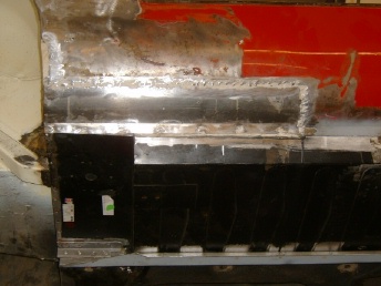 of sold sheet metal. Following this major replacement of the bad metal with the good were many hours of fiddly bits as I dealt with smaller areas of corrosion. I won’t go into the gory details but suffice it say that many smaller patch panels were required to get rid of all the areas along the passenger side that were in need of new steel to replace the rot. Finally I “turned the corner” and got to work on the drivers side. The floor board effort on the drivers side was similar to that on the passenger side. The damage to the sills was a little worse on the drivers side, maybe due to a lifetime of wet shoes transferring their moisture to the carpet.