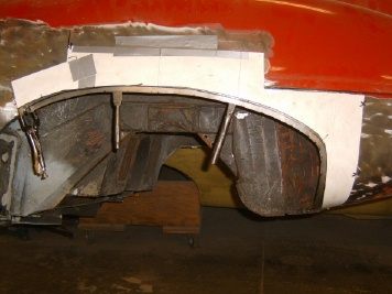 One area that I found to be especially challenging was the repair to the wheel well lip at the rear fender wells. Both sides of the car were well corroded. The E-Type is especially challenging since the wheel well has both an inner and outer panel. The first step it to create a pattern or template. Find a large piece of single ply (not corrugated) card stock. Lay it on the fender opening and trace around the wheel well lip from the back side onto the card stock. Be sure to add some match marks between the edge of the card stock and the body so the card stock can be taken off and then put back in the same place. Once you cut away the rusted material, this pattern will be the only record you have of the original profile.