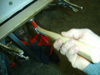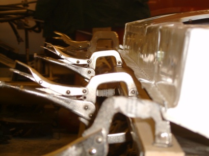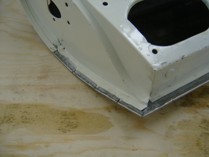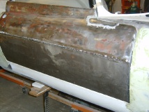 matching new exterior sheet metal to the old. I rough cut the skin to shape, added a slight curve by hand, and used my “joddler” tool to put the offset flange along the top edge. At this point the skin was ready for establishing the bend lines along the remaining three sides. You want to do yourself a favor and select these bend lines carefully to preserve the straight edges of the door frame. Also, careful selection of the bend lines will effect the gap between the door edge and the door opening. These gaps should be set between 1/8″ to 3/16″. More importantly they should be uniform. I provisionally hung the door from its hinges and clamped the skin over the opening. I then applied bend lines onto the skin using a marking pen. The bend line along the bottom edge of the door can be started using a sheet metal brake or by hand. It turns out my brake wouldn’t handle such a large piece so I was forced to clamp the edge between two sturdy boards and apply the first 90 degree of bend with gradual hammering. At this point, the skin must be placed on the doorframe, since completing the fold through 180 degrees effectively captures the door frame and must be done in place. The last 90 degree of bending is done gradually with a hammer and dolly. Finally, the bends on the two sides are applied. As the sheet metal is slightly curved along this edge, slits must be cut every few inches to allow for the curvature. Otherwise, the folding process is done the same with a hammer and dolly. Next fit the door onto the hinges and check its clearance to the 3 sides of the door opening. This is the last chance for small adjustments. Finally, tack weld the skin to the door frame is several places to fix it into position. Whew! It took me a page to describe it and several weekends to actually do it. What a job!