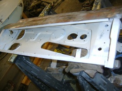 perimeter of the door and the skin falls right off. New door skins are shown in the Martin Robey catalog. Guess what? My favorite parts supplier, Terry’s, says that they have been unavailable for months and they have no idea when they will be resupplied. So I decided on a different approach. Only the bottom edge of the skin and door frame were rusted. Several inches up things looked pretty good. Oh, did I mention the evidence of old collision damage? Maybe things looked good about 10 inches up. So I decided to cut the lower half of the door skin off and fabricate a new piece from scratch. This part of the skin is
