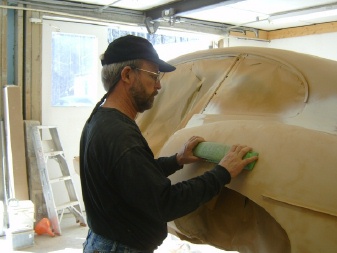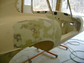 areas of bare metal. These are your high spots. You want to sand down to the high spots in the metal. That means your filler is as thin as possible. I sanded the entire car with 220 paper in preparation for this step. Be sure and blow off the surface with the air hose as you go. This will expose pinholes, which is exasperating, but its better to fill them now with more glazing putty then to find them when you are putting down the color coat. I find that I have to force a dab of glazing putty on the end of my finger into the pinholes. When it dries, sand it smooth.