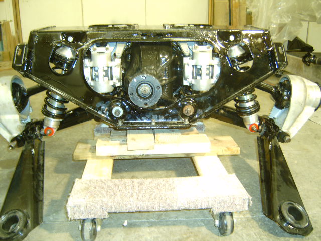 It was with great satisfaction that I stood back and admired the final IRS assembly. The restored IRS always represents a “photo op” in anyone’s restoration effort. I took several shots for my restoration diary. The last step is to use a transmission jack to hoist the thing up into the car. That will come later.