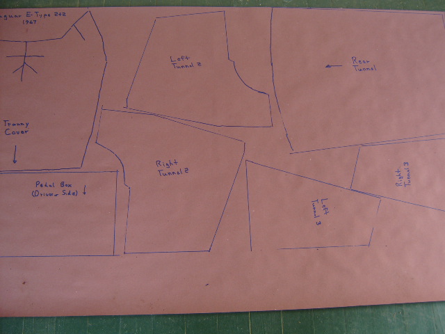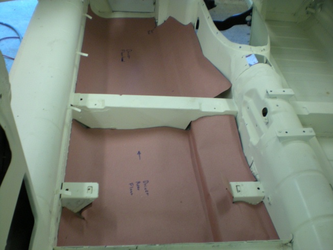 Koolmat’s representative in Mooresville, NC has existing patterns for a Series 1 FHC or OTS. But they didn’t have any patterns for my 2+2. So my first step was to make patterns. I started using newspaper but soon switched to some heavy paper I bought at Home Depot, which may be known as rosin paper. It is redish in color and comes in 36″ wide rolls. The Koolmat material is only 30″ wide and this needs to be considered when making patterns and laying them out. I made up a set of patterns for the floorboards, the footwells, the transmission tunnel, and the removable transmission cover. The Koolmat will easily curve and fold in one direction. To a small degree, it can be molded over compound curves but if much bending in 2 directions is required, you have to add slits. The joints between pieces don’t have to
