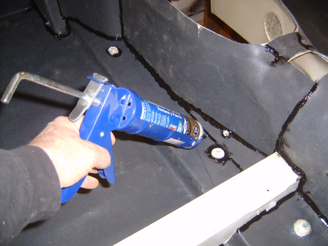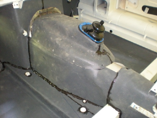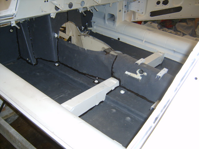 final size based on the pattern. You will find that you have to cut around various items, such as seat mounting brackets and what not. Once you have a few pieces ready, its time to glue them in. Do be aware that the raw Koolmat has a rather distinct smell as it comes off the roll and once you get started with the adhesives the odors become very intense so if at all possible do this job in a well ventilated area. If you are in the vicinity of any gas appliances with pilot lights, these need to be shut off, per the instructions on the can of contact cement. Note that a week after the installation, after everything cured, all the odors were gone.