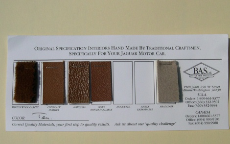 I’m not sure why but in a fit of optimism I started thinking about ordering an upholstery kit. Except I found out the proper term in the business is a “trim” kit, as in one trims out the interior. There are really only a few players in the Jaguar upholstery business. Most of them advertise in our national JCNA magazine. As a means of picking amongst the several firms, I went with the recommendation of the head trimmer at XKs Unlimited, Carl, who said he had very good luck with BAS Ltd. BAS has a website (www.basjaguartrim.com) which has some good information on their services. BAS prides themselves on providing trim materials to the original specification used by Jaguar. They have a number of colors represented on their website. I don’t really trust web photos for totally accurate color presentation but they are close enough to help you narrow your choice down to a few candidates. I have been thinking about reds, my wife Kelli is a fan of tans, and I also found in one of the various originality guides that old English white cars could have come with a blue, black, or green interior. So I contacted BAS and ordered samples of each of these colors. After the samples arrived, Kelli and I took them out and matched them up to the car. As with paint samples, I like to see the samples in direct sunlight, shade, and fluorescent lighting. After much spirited discussion, I was talked out of red and steered to a tan sample as our first choice. I actually also liked the green but was worried that it was one of those love it or hate it colors. It is interesting to note that there are a variety of materials used on the E-Type. Leather is of course the major material used. There is carpet and the headliner material. But hardura, moquette, and vinyl are also used. I had no idea!