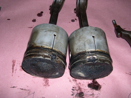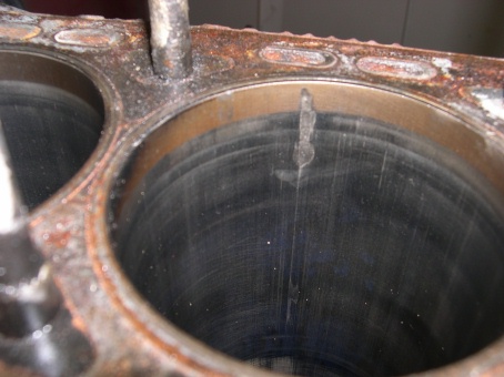 bad shape, with the ring grooves very battered. Next came an inspection of the cylinder bores. A cursory inspection revealed pretty deep scratches in 2 of the bores in the same area where I identified piston damage.