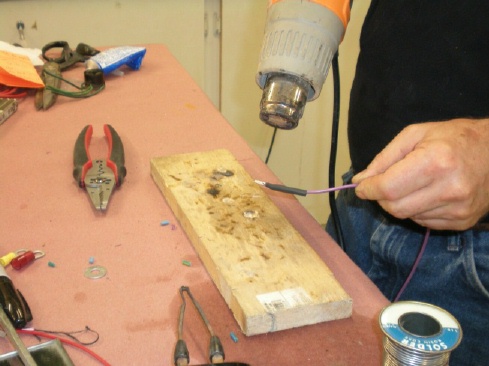 Now back to the wiring connections. Most of the components on the E-Type use a ¼” male spade (or blade) connector. The wiring is connected using a female spade connector. These are common on many cars and available in quantity from NAPA. The following sequence of 4 photos shows the basic process. Strip the insulation off the wire about ¼”, insert the bare wire into the connector, crimp, solder, and fit a heat shrinkable tube over the connection. The key improvements are that the soldered connection is very good electrically and the heat shrinkable tubing provides a springy interface between the flexible wire and the rigid solder connection.