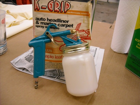 So now is a good time to talk about adhesives. The headliner is actually a tough test for your chosen adhesive. It has to hold up the full weight of the material and it has to be good in high heat situations. My research indicated that big box store contact cement would not hold up. More surprising, 3M spray upholstery adhesives are reported to not be up to the task. In addition, I wanted to be able to spray the adhesive out of a spray gun, like I have seen done on TV. I contacted an upholstery supply house and they recommended K-Grip automotive and marine spray adhesive. Plus they sourced me a simple siphon action spray gun. With a little experimentation, I was able to obtain an acceptable spray pattern from the gun. Much easier than using a brush!