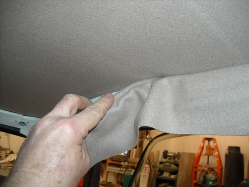 Once the foam and the felt are glued in place, the perimeter trim strips are next. On my car, there is a supplemental piece of sheet steel around the perimeter that provides a gap into which the perimeter strip is inserted. The perimeter trim strip comes prepped from BAS with an edge that is wrapped around a small, hollow rubber tube. Being hollow, the tube can be compressed and squeezed into the gap. Once inside, the tube expands and retains the trim material. The bottom edge of the trim material is glued to the sheet metal, below the line of the window surround trim strip.