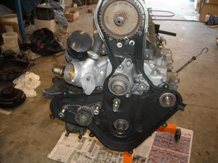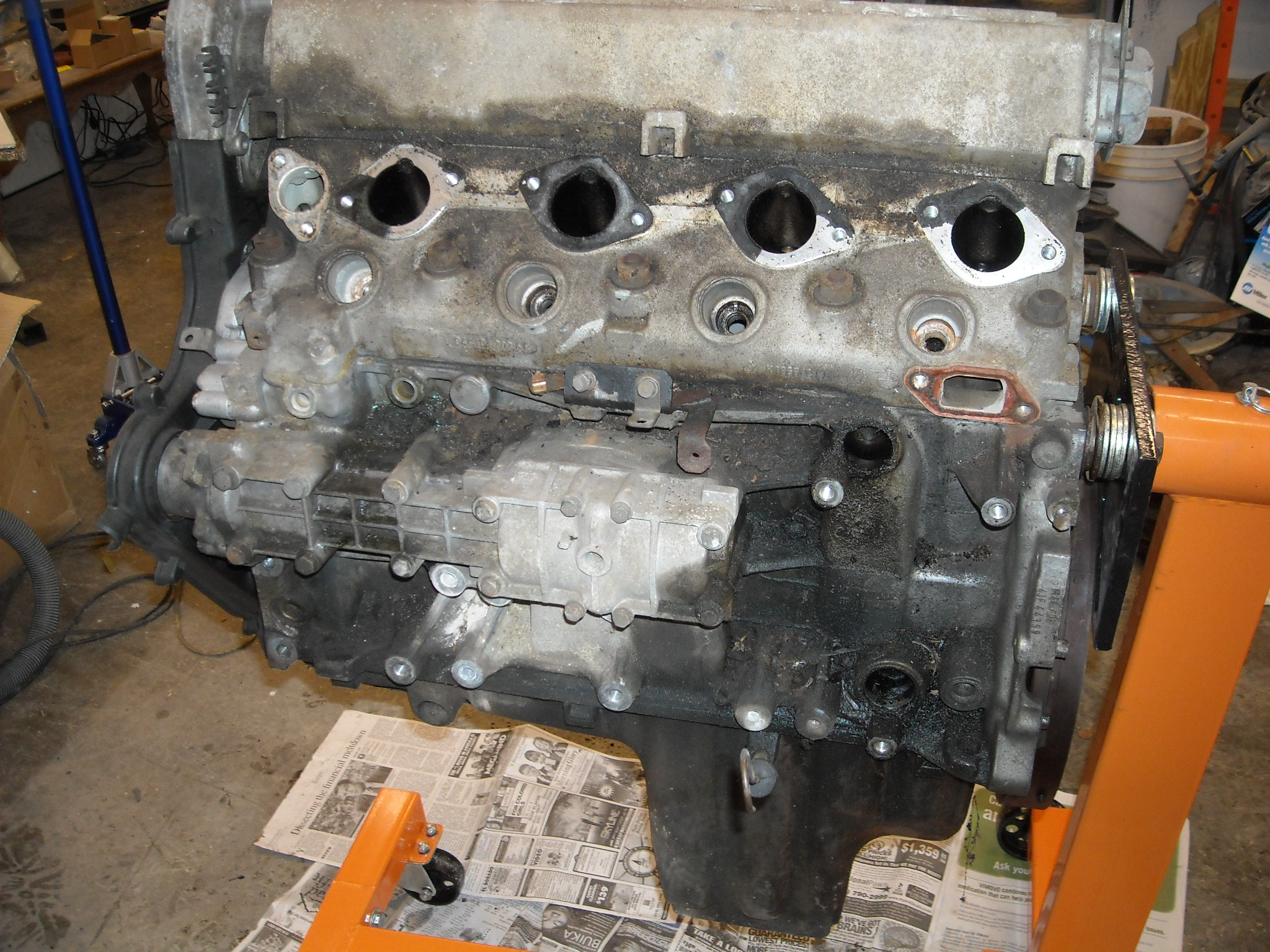 There were parts of the teardown that I remember that required special tools. Getting the large bolt out of the end of the camshaft that holds on the timing belt gear – it has a “triple square” head. Go ahead and spring for a set of triple square bits. An impact wrench is nice but probably not absolutely mandatory. Getting at the internal hex head bolts that hold on the cam tower was scary. I took out the round plugs in the cam tower and inserted a hex key into the head of the bolt, after application of Kroil. I put a wrench on the “L” of the hex key and thought something was going to break, it took so much force. I subsequently sprang for a set of straight shaft hex bits that adapt to a 3/8″ socket drive. Get the long ones that will reach into the depths of the cam tower. They aren’t cheap but they are worth it. Of course you need a pretty large socket and a flywheel lock to get the nut off the end of the crankshaft. Again, an impact wrench is nice but going back you will need to torque this bolt. So the torque wrench that puts the bolt back is sufficient to loosen it also. I also used a gear puller to get various items off the front of the engine.