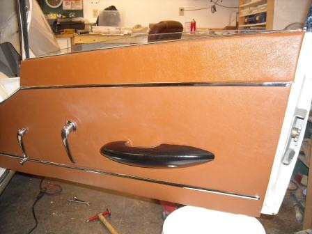First, I would to mention the door panels. If you have to take one apart, first take off the handles and door pull. Then carefully work under the bottom and rear perimeter of the door panel to pry out the spring loaded clips that stab into holes inside the door frame. The bottom panel separates at the upper chrome strip by pulling downward. This will reveal screws that hold on the upper panel. The door panels are made by BAS but you need to salvage your chrome strips.
