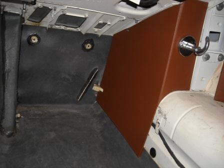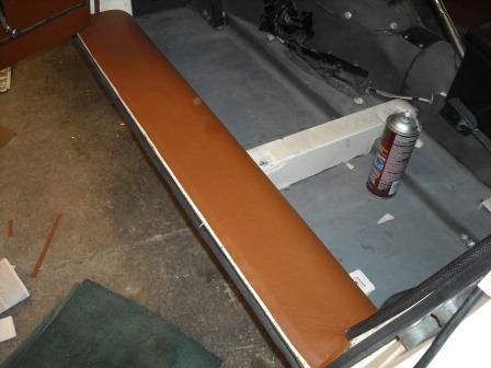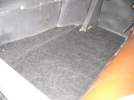 Next I started laying in the felt carpet underlayment and gluing it down with contact cement. Here the various carpet pieces are installed. BAS applied the trimmed edges. Generally a trimmed edge will overlap an untrimmed edge. The center arm rest and storage cubby were next. The top of the cubby was pre-fabricated by BAS.