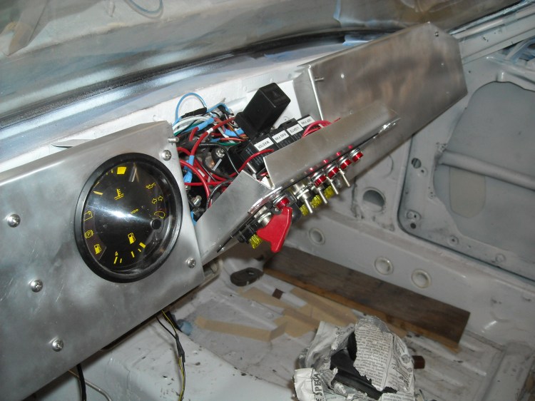 The center of my custom dash held the switch panel. Behind it I mounted relays. I found out later that the load from all of the above through the fuse for the master on/off switch would blow a 40 amp fuse. Not wanting to go any bigger on the fuse, I had to install additional relays for the radiator fan and the headlights in the engine compartment and feed them directly from the alternator.