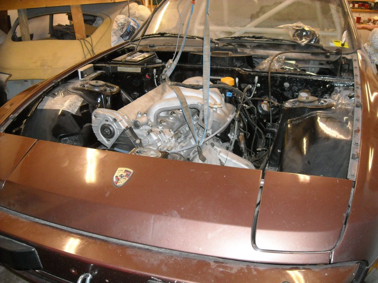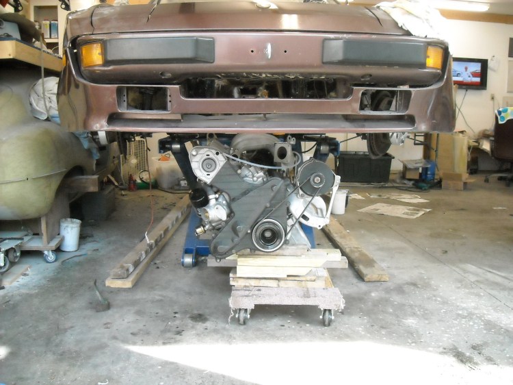 I eventually reached the point where it was time to install the newly assembled engine into the car. Due to my garage layout and equipment, I chose to install the engine from underneath. The front of the car was hoisted up high enough to move the engine under the car, on its cart. I then lowered the car quite a bit but at some point I stopped the descent of the car and placed it on jackstands and re-attached the hoist (a come-a-long) to the engine. You can have quite a few items attached to the engine such as intake manifold, exhaust manifold, and alternator.