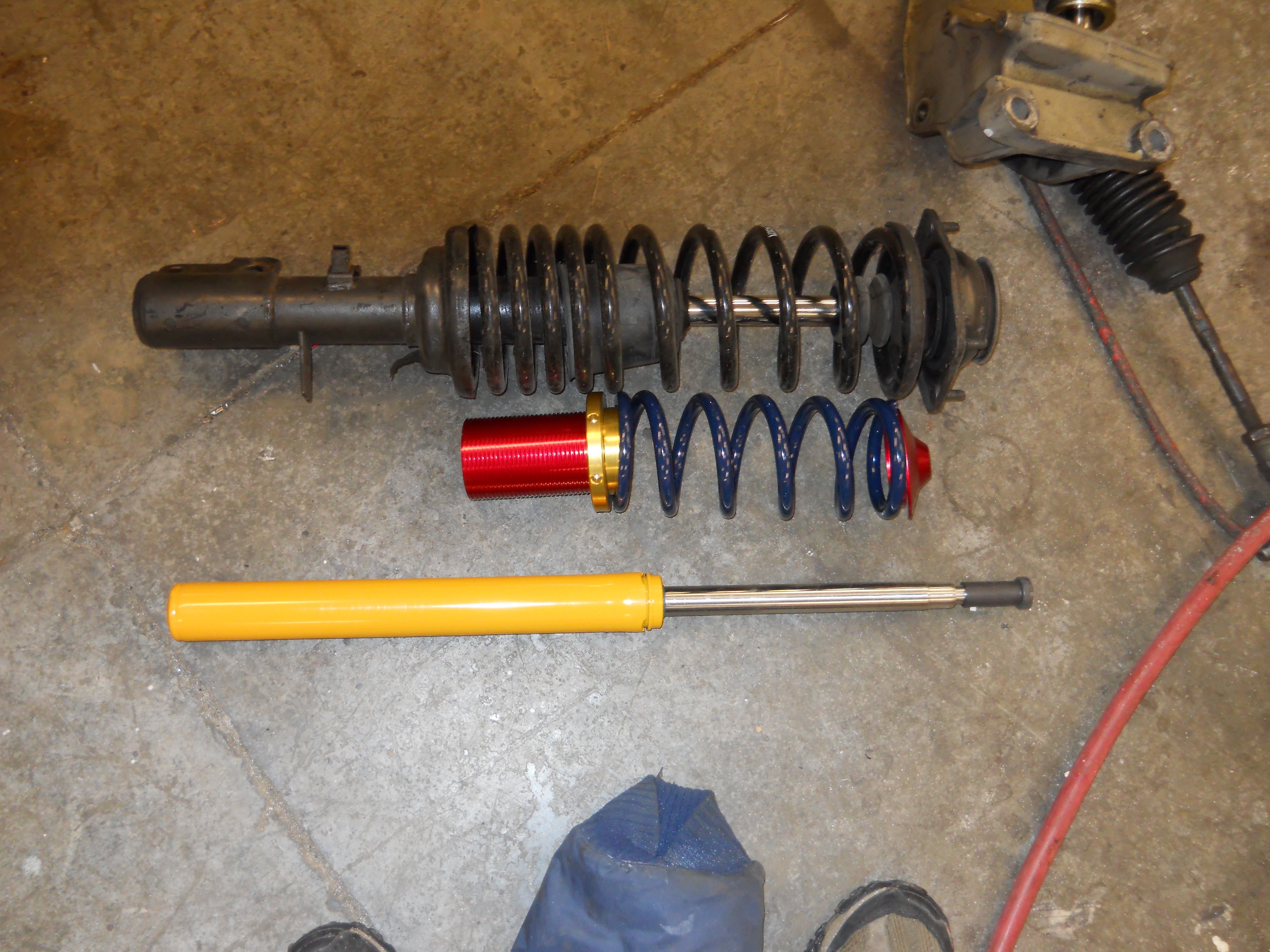 The new yellow Koni strut cartridge inserts cleanly into the strut tube. The directions were not clear but the pictograph is trying to say “Add some anti-freeze to the tube”. Jason says this helps heat transfer from the hot cartridge during heavy track use. You put the screw on cap back on. But before you do this, install the spring height adjustment pieces, as they won’t fit over the cap. Then you can set the spring into place and install the bump stop over the shaft. Here are some pics of the installed pieces.