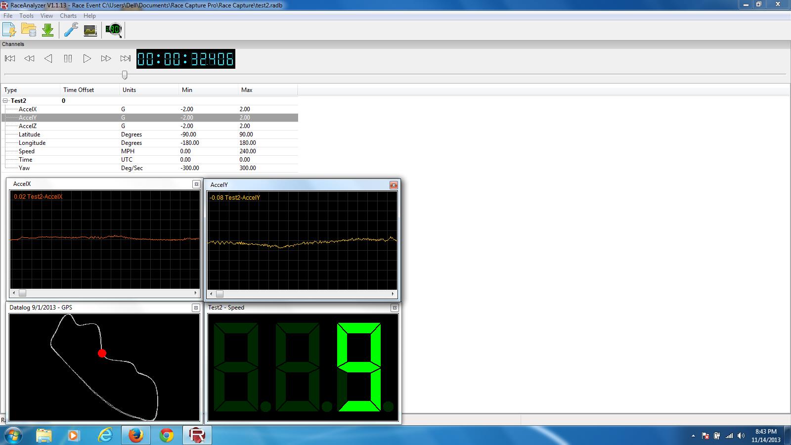 Anyway, I decided to purchase a Race Capture Pro (RCP) to use in my Porsche 944 track car. There’s a lot of good info about the device at the Autosports Lab website so I won’t repeat that part here. After I received my RCP I went to their website and followed the instructions for the Quick Installation. After hooking up with a USB cord to my small laptop, I was able to get started collecting data. My first venture was a trip around the block in my street car. I set the GPS antenna on the dash and off I went. Without any external sensor hookups (except the GPS antenna and the USB cord, the device captures latitude, longitude, X/Y/Z/yaw accelerations, and speed. Results are written to a SD card. When you are done with your driving event, you pop the SD card into a laptop to review the results on the Race Analyzer software, available for download from the RCP website. Below is a screen shot of my trip around the block.