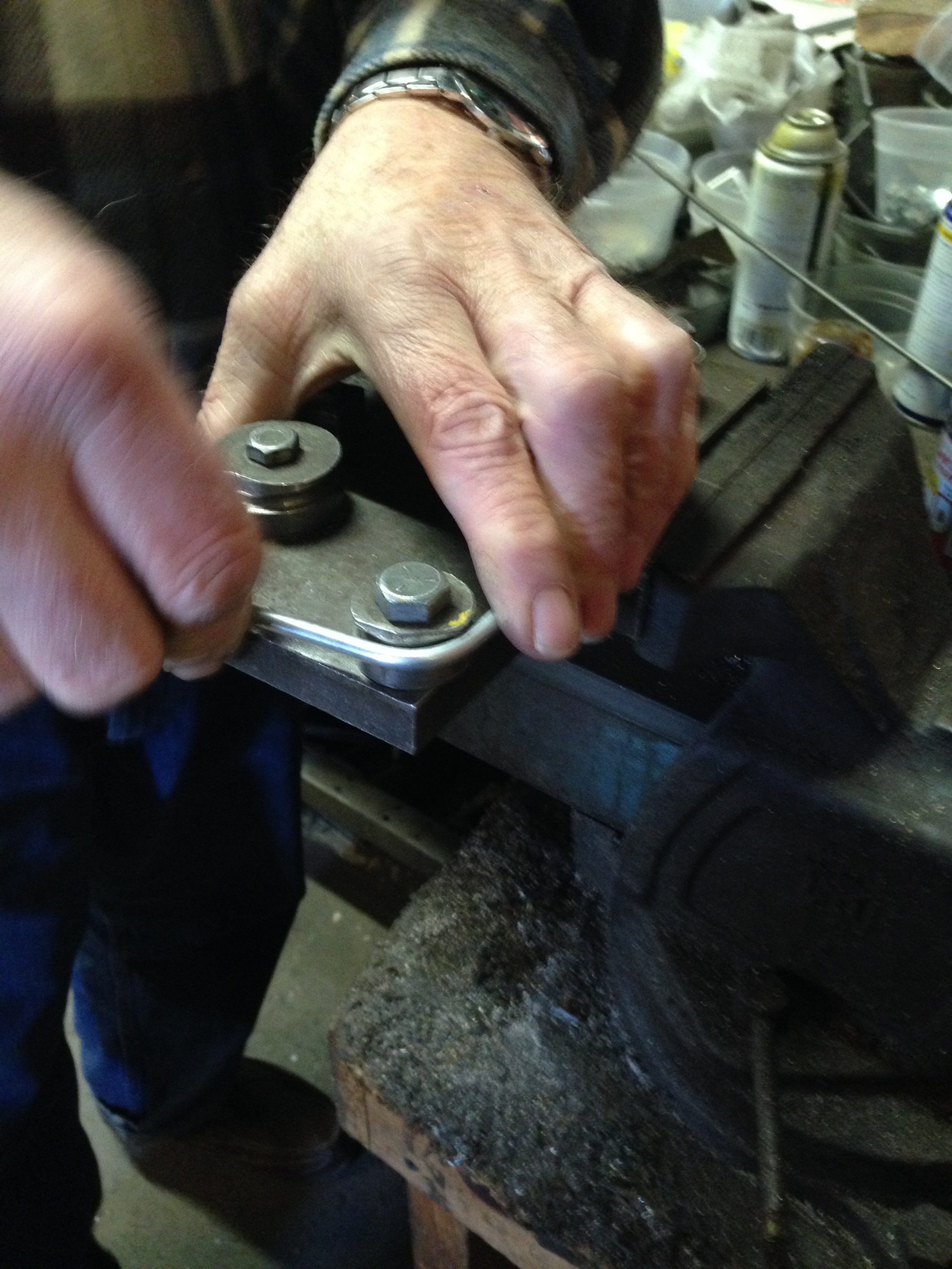 John started out with simple components. The following sequence of photos shows how he built a simple fixture to bend up a brake cylinder crossover pipe.