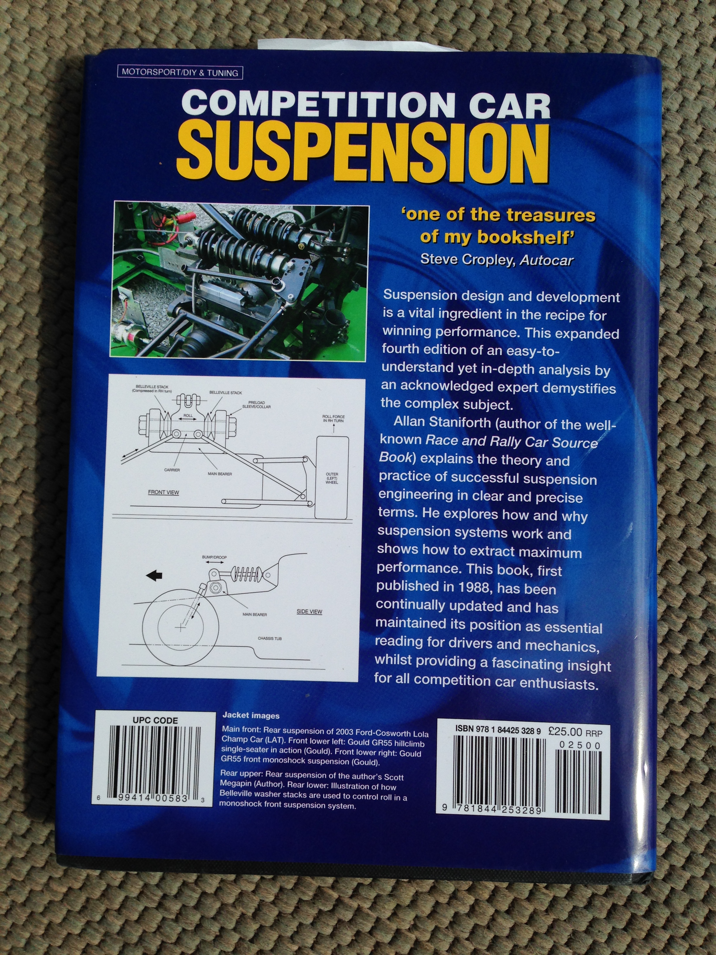 I will start out by saying that if you were only allowed to read one text about suspension design, this book would be at the top of my list. (But see comment below) As stated on the inside cover “The design and development of competition car suspension systems is a vital ingredient of winning performance. Here, Allan Staniforth, an acknowledged expert on the subject, explains the theory and practice of successful suspension engineering and explores in an easy-to-understand and readable style how and why suspension systems work.”