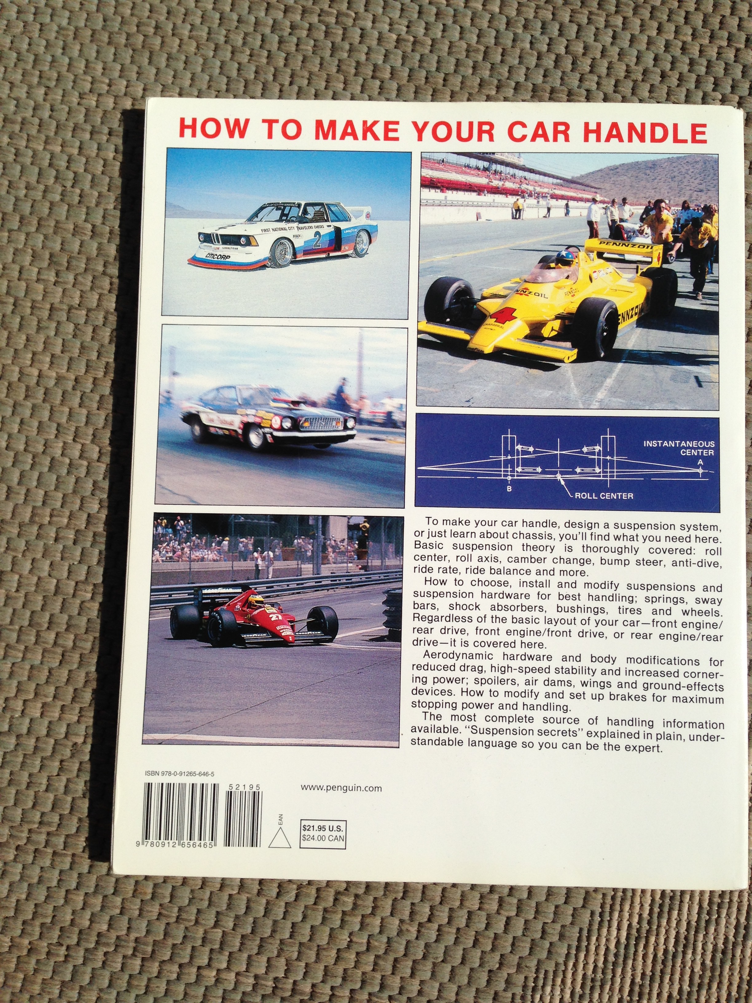 It has been a while since I originally read this book so I took a minute to review it before I wrote this report. The copyright date is listed as 1981 and the book indeed dates back to that timeframe. As a consequence much of the info and cars used as examples is dated. In particular the tire discussion is way out of date. But, if you own a car that has little or no aero i.e. wings, splitters, under trays, etc. that produce significant downforce, then I think you owe it to yourself to read this book. It is a pet peeve of mine that many folks are running some ridiculous spring rates on their cars. It is my opinion that for many of us that do not have cars that produce downforce, this is unnecessary and probably not advisable. I know that race cars that rely on aero have to go to great lengths to limit ride height changes in order to maintain an optimum aero profile at different speeds. With a car like my Porsche 944, there is no downforce. So getting to my point about this book, as I reviewed it I was reminded that this book was written at a time when aero was around but not all that common. Puhn has a good discussion about setting your basic spring rates on a natural frequency criteria, with a rough target of around 2 hertz. Setting your suspension frequency up at 2 hertz, I can assure you that you won’t be running 900 lb springs! So by reading this book you will get a good understanding of how suspensions were selected before aero was such a concern. Not a bad thing at all!