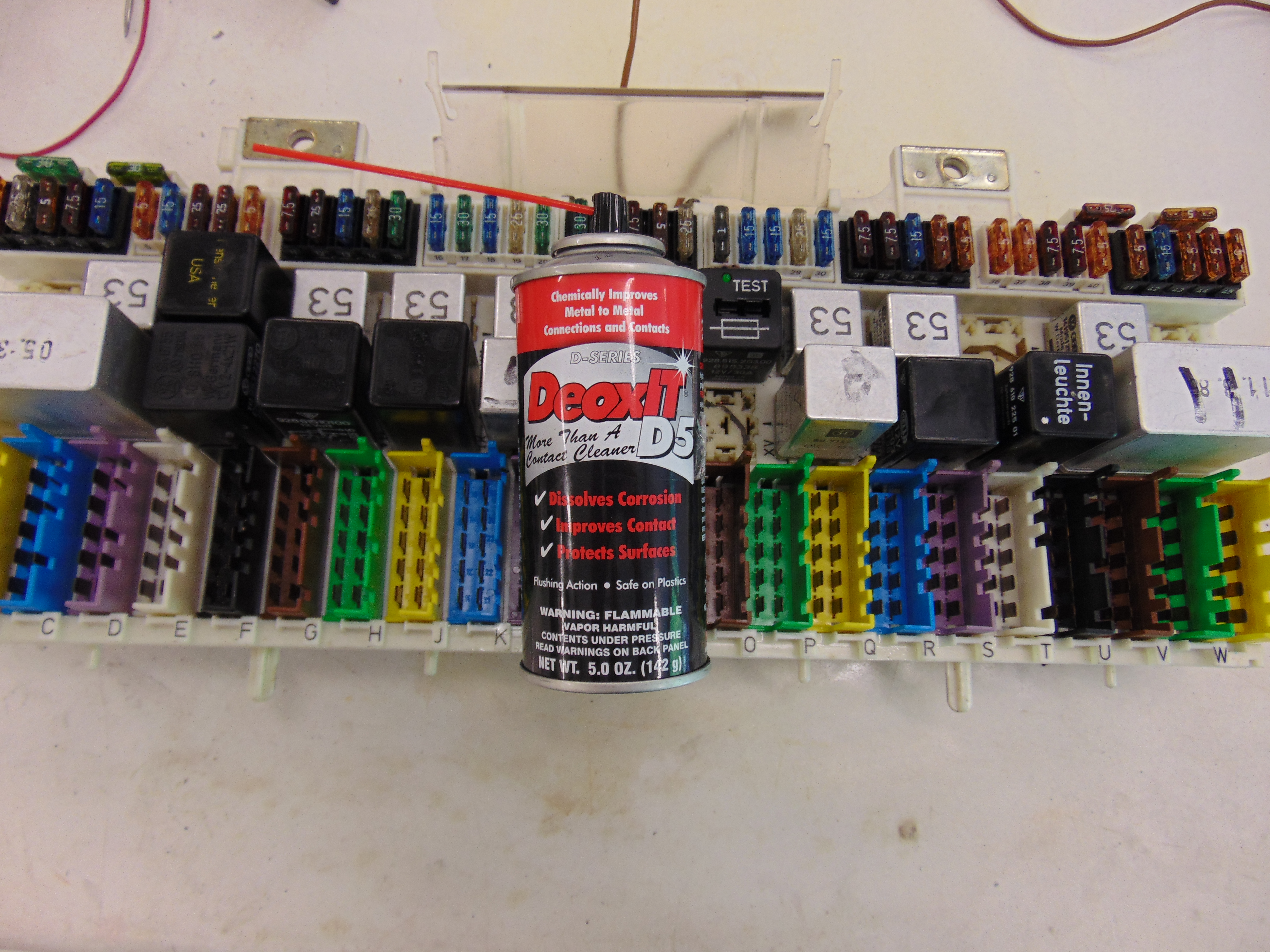 Don’t worry, you don’t have to touch that snake’s nest of wires on the back side of the panel! I had a simple little plastic fuse puller that you can buy for a few bucks that made short work of pulling the fuses. I cleaned all the contact surfaces with Deoxit brand contact cleaner. It is recommended by folks on Rennlist and available from Radio Shack. I pulled and cleaned all the fuses. Then I pulled and cleaned all the relays. Note that a few relay sockets are intentionally empty. Also one socket for the wiring plugs was empty on my car. Take lots of photos!