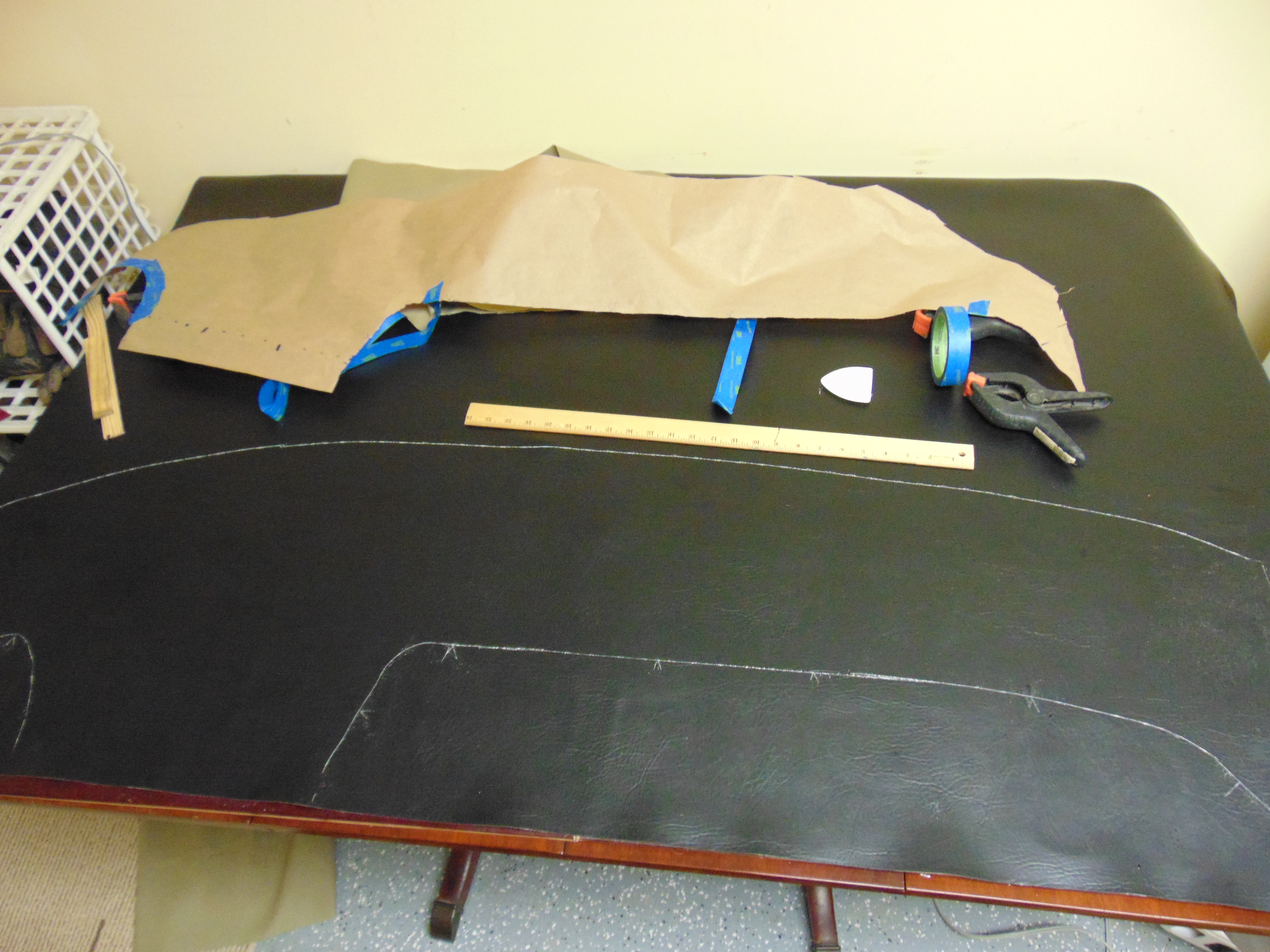 Some folks use a French seam across the entire width of the dash, including the instrument binnacle. I decided to just wrap the vinyl around the binnacle edge. I decided to glue some thin foam over the entire dash in an attempt to mask small imperfections that might telegraph through to the vinyl. Since at the French seam, the vinyl is is double thickness, I left a strip with no thin foam where the French seam goes, to avoid an unsightly lump along the seam.