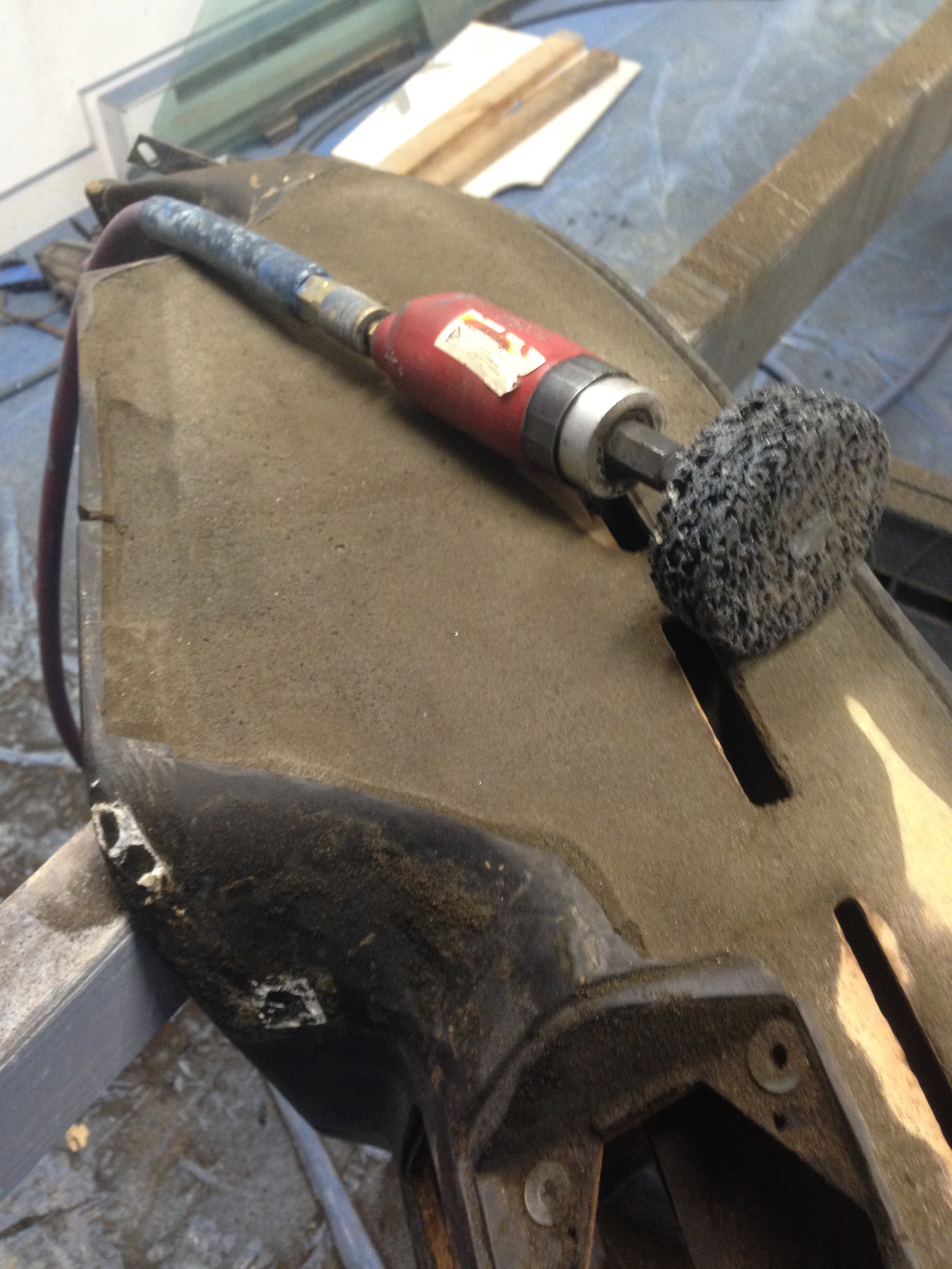 The 944 dash appears to start with a rough underlayment formed out of a thick paper type material. I think the paper must have been wet and sprayed into a mold, as it is actually a pretty complex shape. It would appear that a foam material is sprayed on top of the paper. The final step is a thin layer of vinyl material. It is quite possible that the vinyl was sprayed first, into a mold, followed by the foam, and then the paper. After 30 years the foam is quite brittle and I suspect its shrinkage causes the vinyl to crack. My plan was to recover the entire dash with vinyl. Not OEM but certainly presentable for a track car. I first used a rotary grinding disk to remove the most heavily damaged areas. In same cases, the original vinyl can just be pulled off in strips. The rotary disk threw a generous layer of black dust around the workshop!