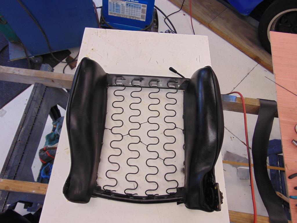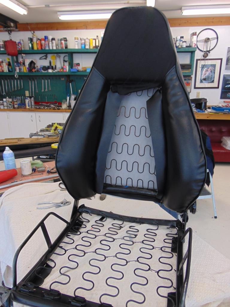 Back frame with vinyl and re-attached to the seat base frame. This turned out to be a mistake. You will want to complete the base bolsters first as they need to go over the hinge points before you attach the back.
