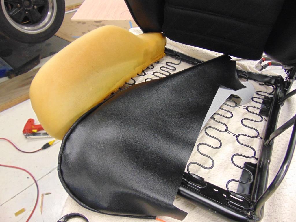 The curvaceous bolsters were a special challenge. I am pretty sure that the factory used techniques to form the vinyl into a 3D shape. See the photo below.