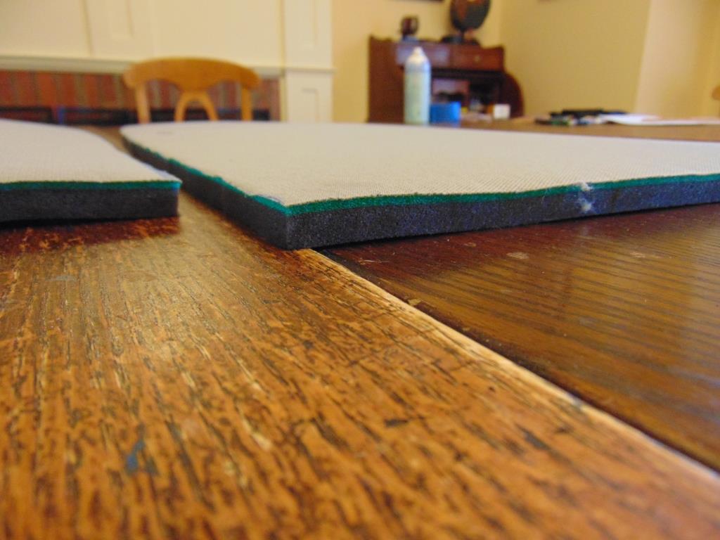 In this picture, the fabric is laid face down and the foam is being glued to it with the basting spray, which shows as whitish streaks in this picture.