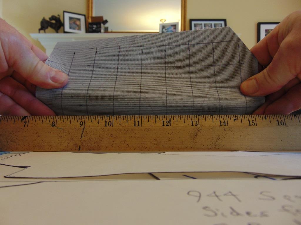 Here the fabric has been glued to the foam and the reference lines for the stitching added. Don’t add the lines until after you have glued the cloth, as it will move a little on you up to that point. The lines are done in chalk, which can be wiped away later .