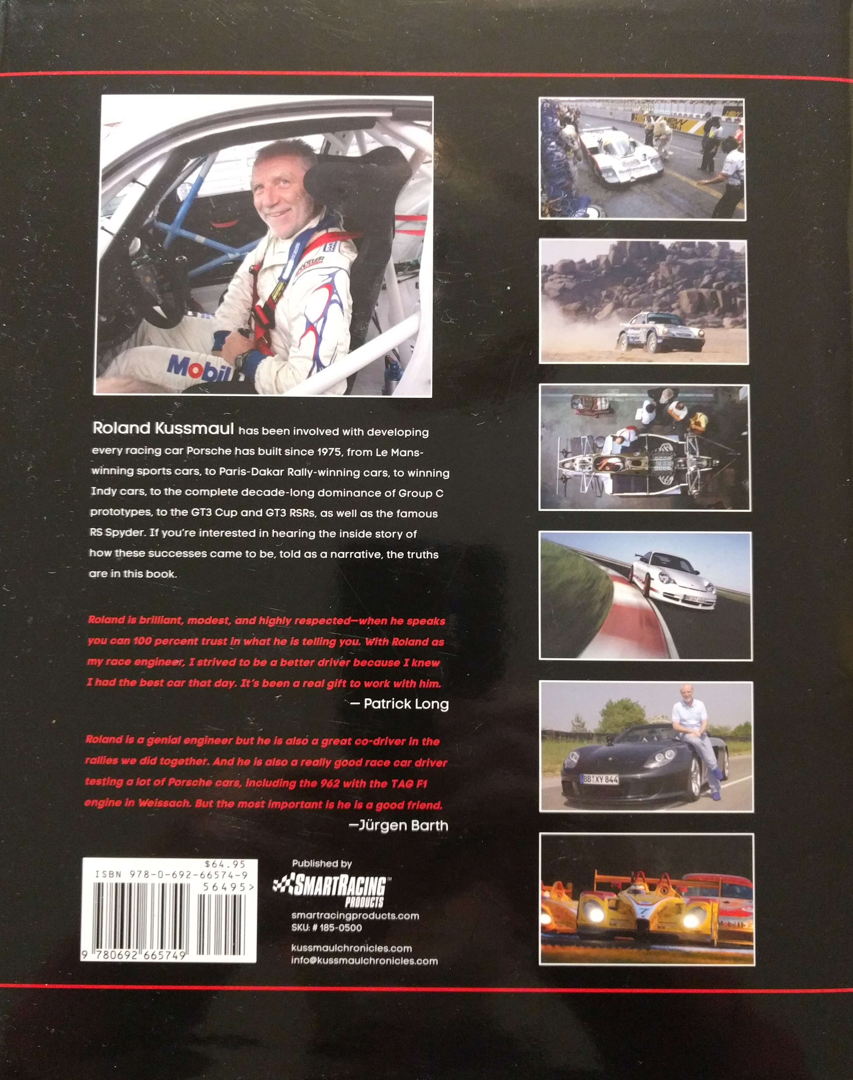 I can’t remember where I found a recommendation to purchase and read this book but I am very glad I did! The format is very intriguing. The author, Craig Watkins, an accomplished racer and race engineer in his own right, spent many hours interviewing Roland Kussmaul. I was not familiar with Roland before I read this book but he has quite the story to tell. Craig transcribed and edited the interviews and developed this book. It is over 400 pages, very well written, and with some great photography. Craig also did something that I haven’t seen before. He embedded “QR Droid” codes at various places in the book. After downloading a QR code scanner to my smartphone, I was able to scan the codes, which took me to a Youtube posted by Craig that contained actual audio (with mainly still photos) of the pertinent interview session where Roland was telling about his experiences. Roland is German and, although he speaks passable English, it would probably be tedious to listen to the entire content of the book this way. So for the bulk of the book you get to read and comprehend this guy’s amazing story, without having the language barrier get in the way. Roland does have some amusing euphemisms, which Craig faithfully transcribes. A lot of things are “shit” and “blah, blah, blah” gets used a lot. And you can hear Rolands grandchildren playing in the background. The Youtube segments really help the reader get comfortable with the guy telling the story, without us all having to fly to Germany and visit for a month.