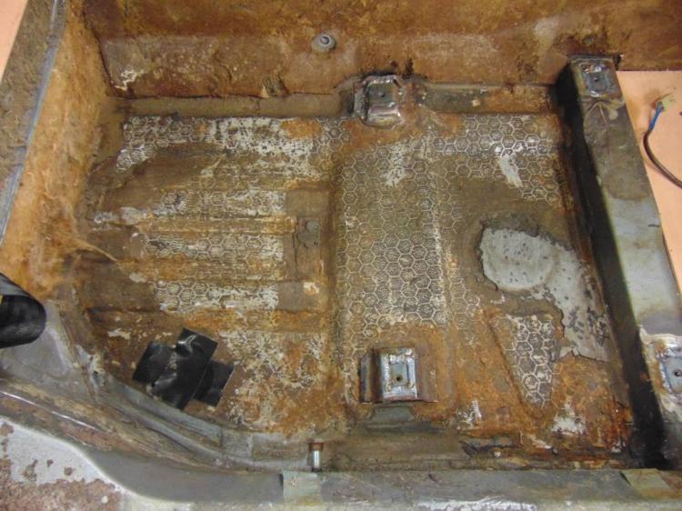 Floor with most of the sound deadening material removed. Not discussed in this article but all 8 seat attachment bolting locations were compromised and were cut out and new heavy duty weldable nuts were welded in.