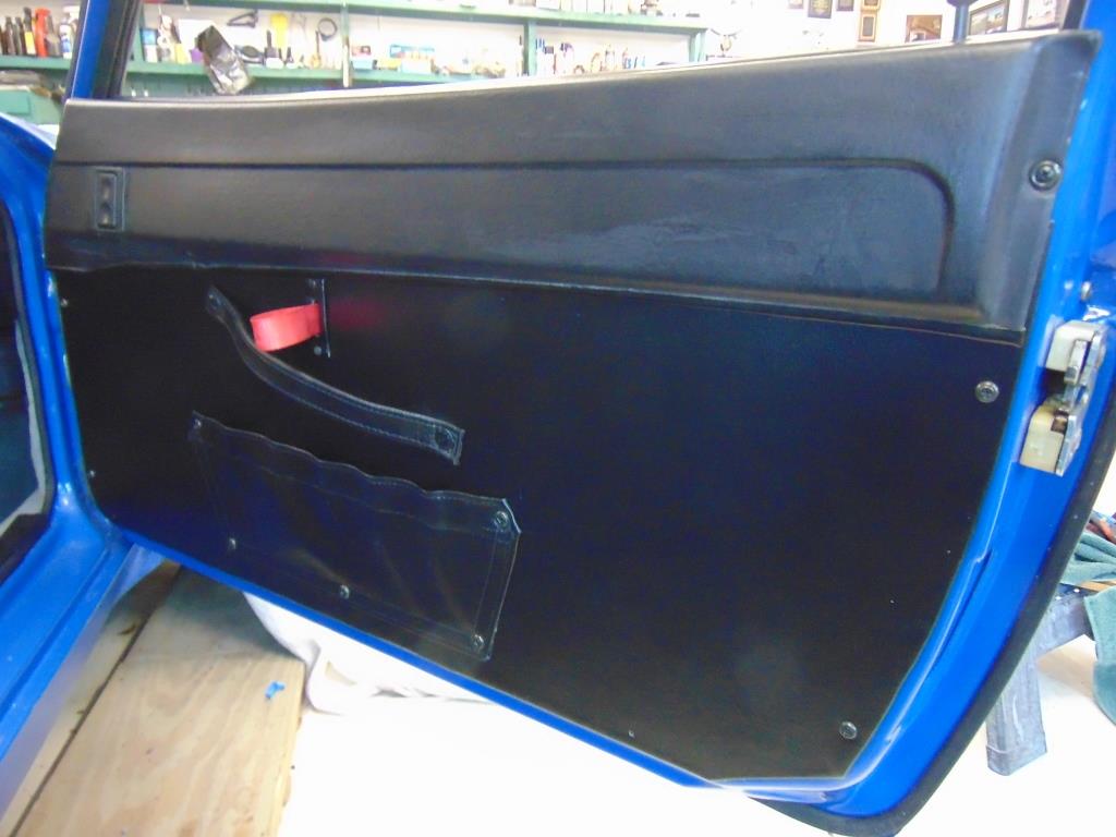 Aluminum sheet is used for the lower door card. The top part of the OEM door card was cut off with a razor knife and re-used. Leather door strap is shown, before being painted black.