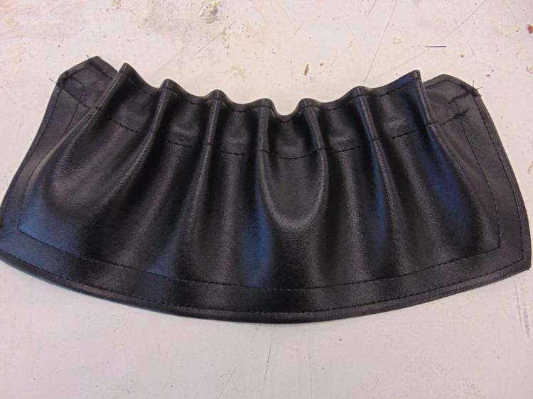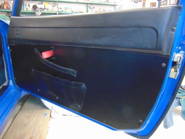 After reviewing the situation, I came up for the solution for the door pulls as shown in the picture above. I have to admit that these are mainly “bling” as the standard interior door latches are very light weight and with their mechanical advantage, are actually easier to open the door with than the pulls that I designed. That said, the cloth pulls look very cool and make a statement as to the sporting nature of the car. I had to re-use the upper portion of the stock door card, as it is a complex shape that I could not easily reproduce. I simply cut the top part off and re-used it. For the lower section, I cut aluminum sheet to the desired shape and covered it with vinyl. The pull straps were formed from a tri-fold strip of leather, glued and sewn. The map pockets actually turned out to be tricky, as they have an elastic top to hold them closed. I think they turned out pretty well!