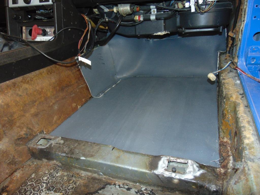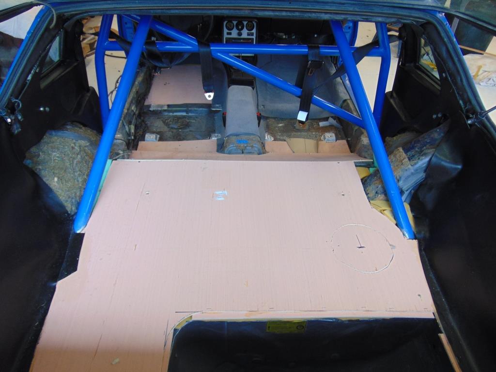 Driver’s side floor area. Sloped shelf over the former rear seat area is also shown. New seat belts. The door threshold piece and the parking brakes were painted.