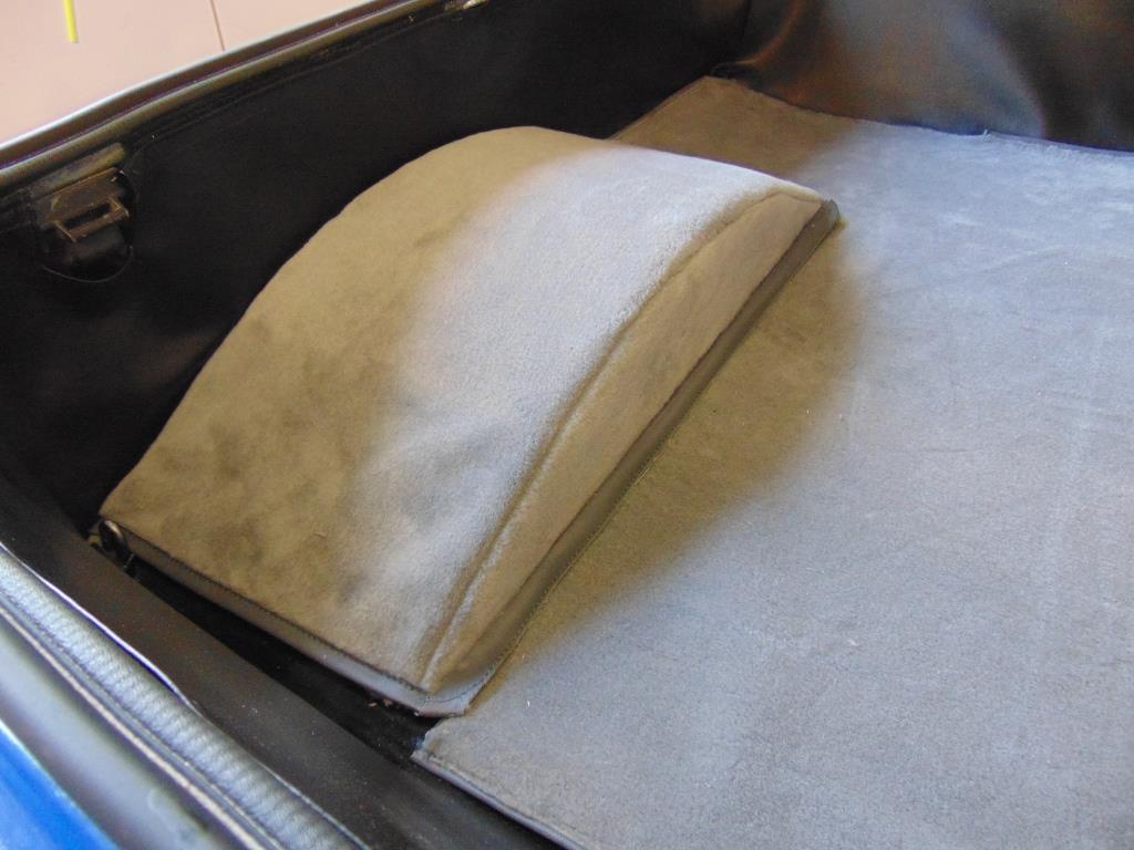 I had saved the old carpet pieces and inspected them. It was obvious that Porsche was able to form or mold some of the pieces. The main piece for the cockpit went from door to door, passing over the torque tube tunnel. I decided the break the job down into smaller more manageable pieces. The torque tube tunnel was one piece. The front floor boards were one piece. The rear floor boards were one piece. And the rear cargo area was one piece. Any cut edge that was visible was “bound” with a sewn strip of similar colored vinyl. There are a number of smaller pieces on the vertical surfaces that surround the cockpit. One area where I used vinyl instead of carpet is at the 3 sides of the rear compartment, as shown in the photo below. The top edge is secured with velcro so that the area behind can be accessed for maintenance. I also replaced the vinyl in the overhead area surrounding the sunroof. Finally, I fashioned a cover for the spare tire, as shown in the photo below. With a track car, you will be required to remove the spare tire and jack at every event so I wanted to make this as painless as possible.