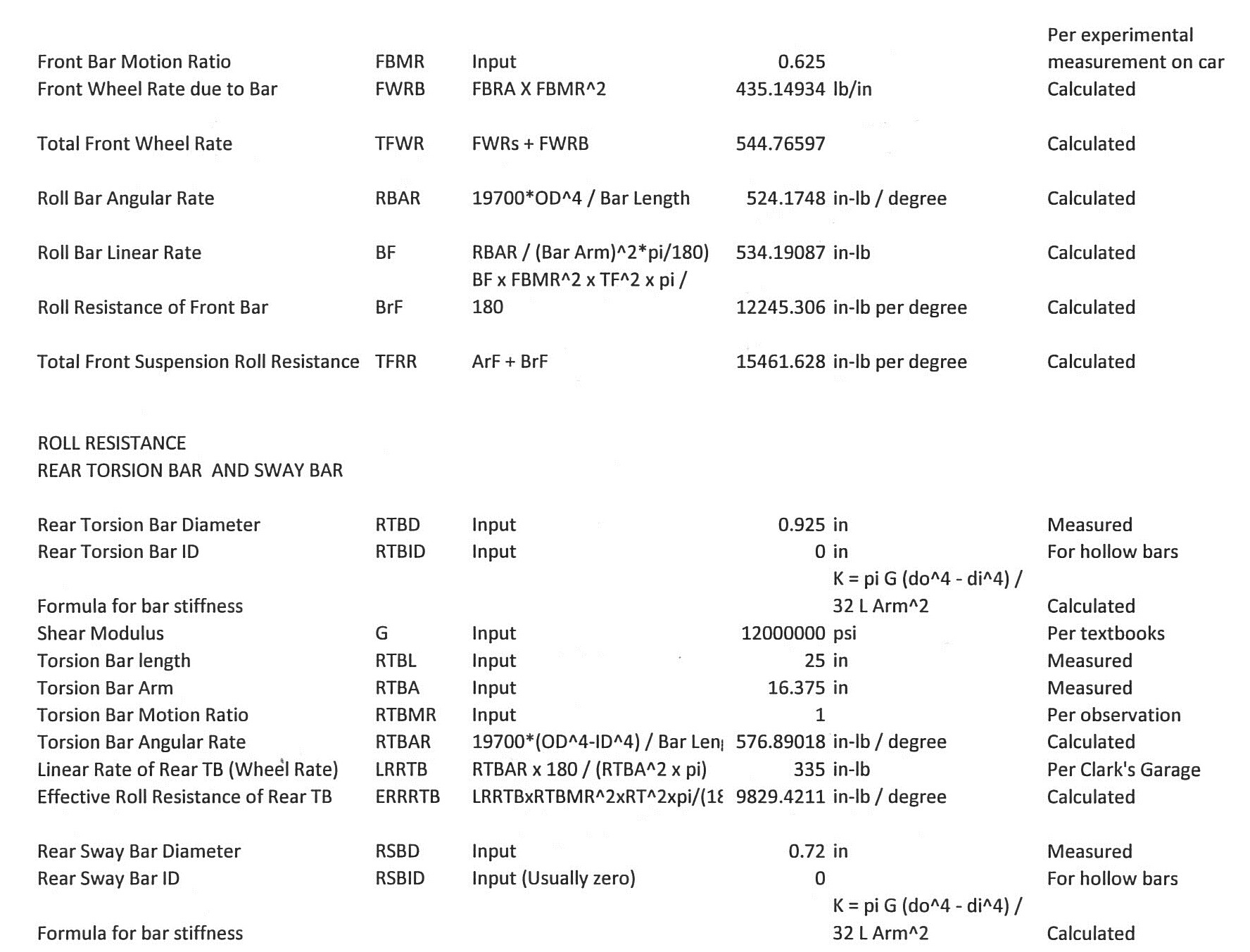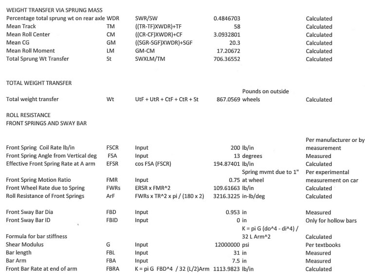 The remainder of the spreadsheet calculates whether your spring and roll bar selection will result in a balanced transfer of load to the front and rear of the car. If you get it wrong, your car will “push” i.e. exhibit understeer or it will be “loose” i.e. exhibit oversteer. Oversteer is when the rear of the car is trying to come around and kill you. Understeer is when the front of the car wants to push off the track and kill you. Both are to be avoided, although most passenger cars are set up with understeer, since it behaves more benignly as the throttle is lifted and the brakes applied.