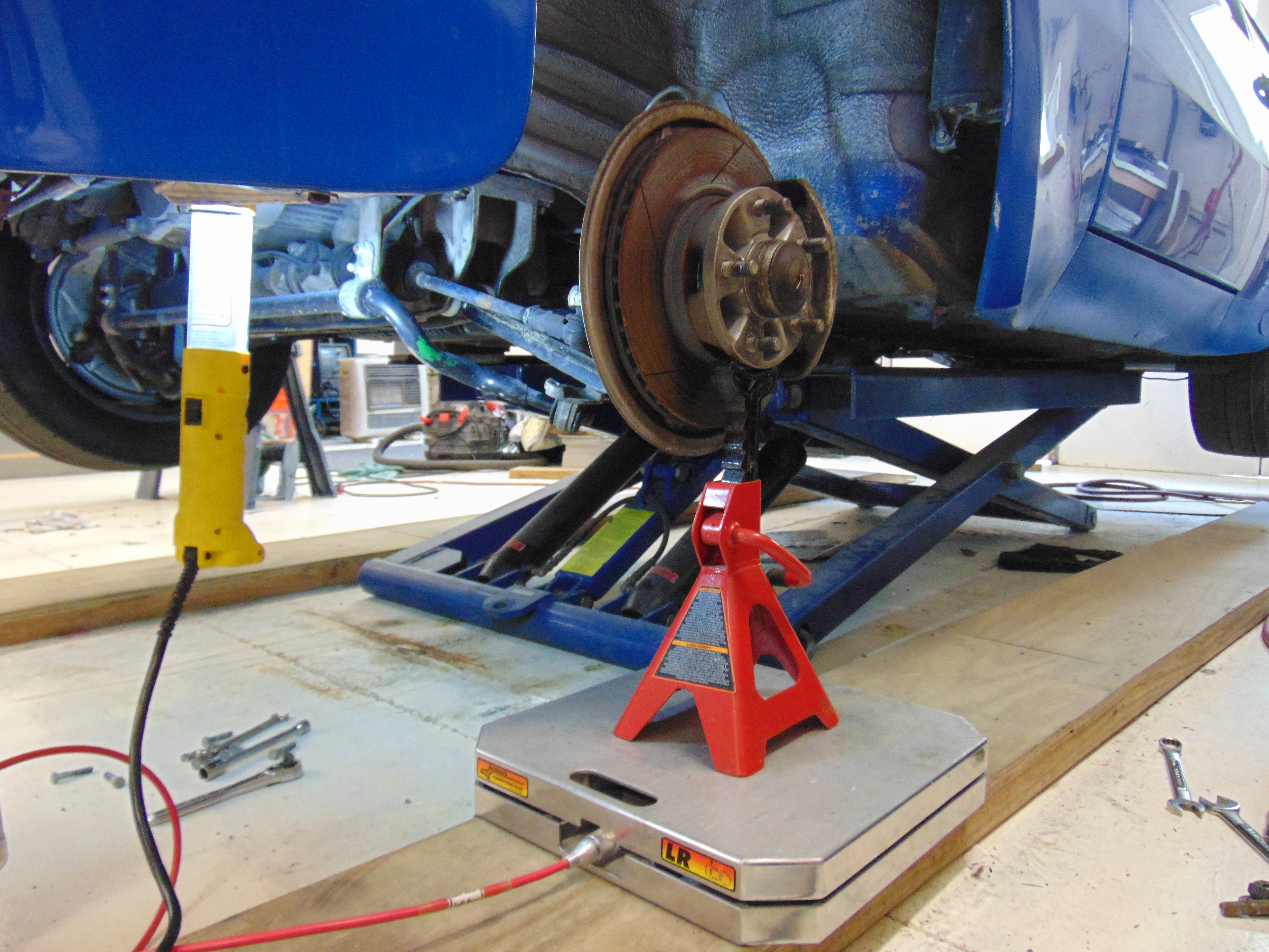 So once you have the car on the scales, obtaining the weight on the front and rear axles is very simple. Getting the unsprung weight (the weight of the car that is not supported by the springs) is a little tougher. If you have the suspension torn apart, you can weigh the individual components. It is certainly easy to take the tire/wheel off and weight it. What I did is shown in the following photo. This only works if the springs and the torsion bars are not engaged. I would say that if you were to take off the rotor and disc brake caliper and weigh those and add them to the tire weight, you would be pretty close.