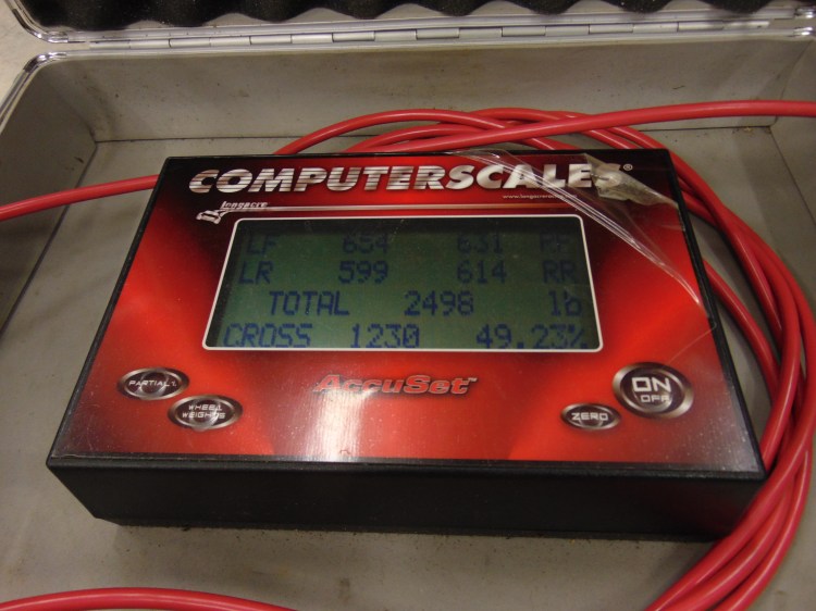 As you can see, you won’t get very far unless you have access to some scales. I purchased my scales from Longacre a few years ago and have used them a lot. Due to the weights involved, I don’t believe bathroom type scales would cut it, although I’m sure someone somewhere has figured out a way to use them and save some money. I am proud to announce that the weight loss plan for 944 street/track car resulted in a dry weight just under 2500 pounds. This did not include any fuel, the radiator was dry, and the spare tire removed. But in general, you’ll want to check your suspension weights with all fluids, including at least 1/3 of a tank of fuel. The driver also adds weight but I tend to check the car without the driver, because it tends to be a hassle and it is near the fore/aft center of gravity of the car, where its effect is less significant.