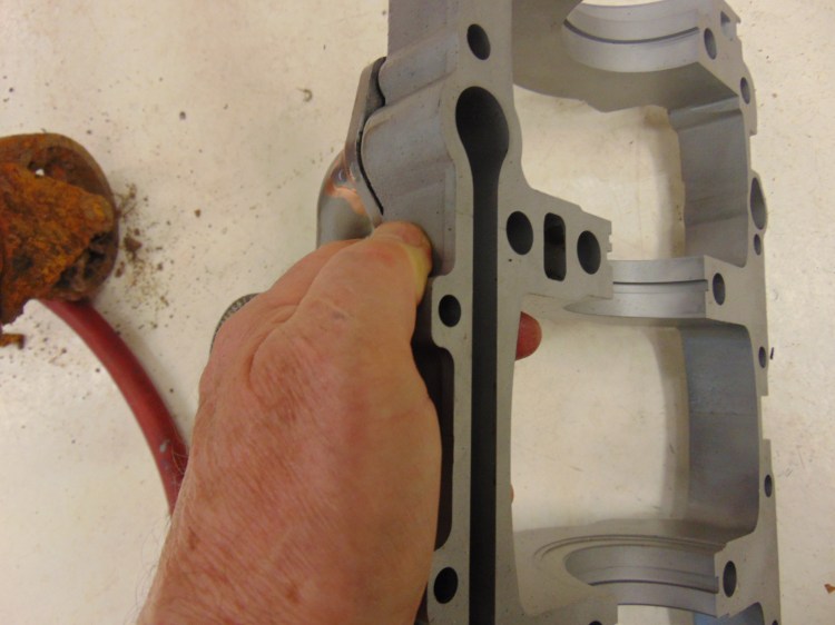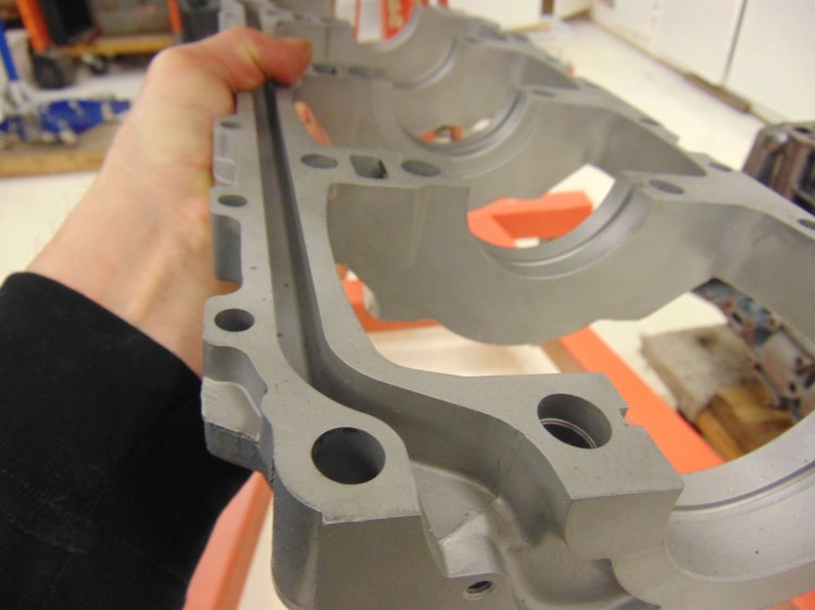 The above picture shows the passage way machined into the crank girdle. This passage leads forward to the front of the block, where the oil pump is mounted. This passage way is hermetically sealed against the bottom of the block. You can also see the 5 mounting points for the crankshaft bearing shells.