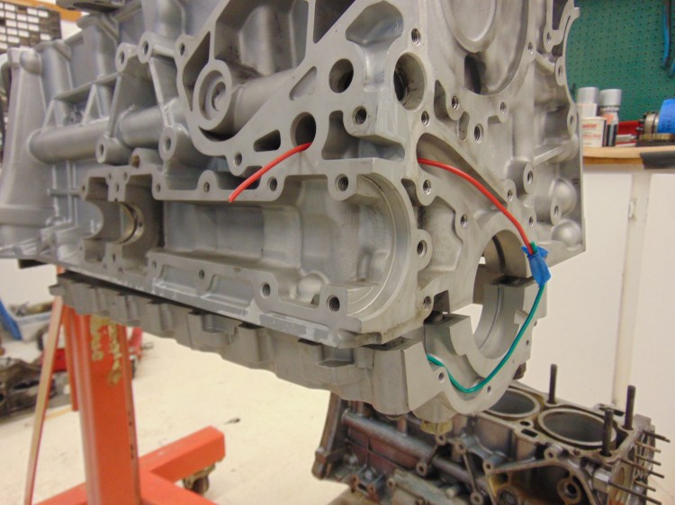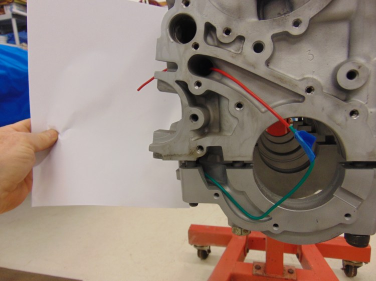 So here we are getting close to the actual oil pump. In this picture the crank girdle is loosely mounted for the photo, with a gap with respect to the block. The green wire on the lower left is emerging from the opening from the oil passageway. This is the oil suction point for the pump. The pump will eject pressurized oil at the point where the red wire starts. As we will see in the following photos of the oil pump, the oblong opening in the block is matched by the pump exit. The red wire emerging from the left side of the block is from the opening where the oil pressure relief mechanism goes.