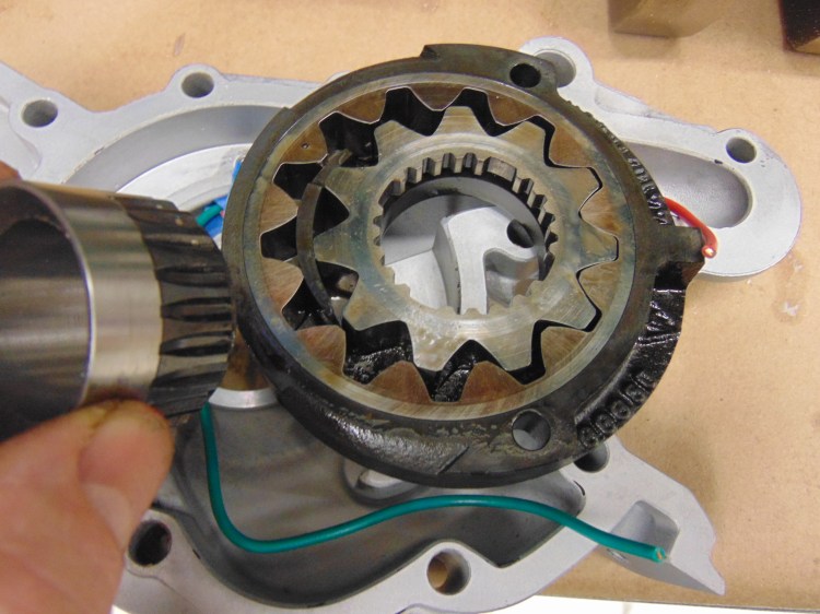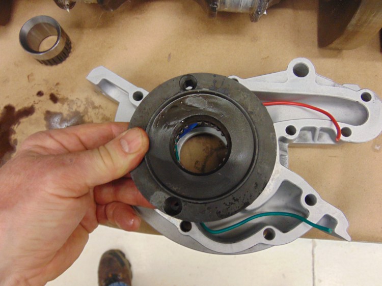 Here is the impeller. An interesting but simple mechanical pump. The center line of the inner gear with 11 lobes is offset from the center line of the outer housing. As we will see in the video below, the inner gear is rotated by the insert mounted on the crankshaft (in this picture held by my fingers, in the next picture mounted in place). The resulting motion gathers up oil at the 6 o’clock position, moves it up past the 9 o’clock position, and squeezes it out at the 12 o’clock position.