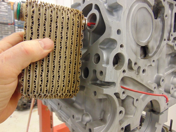 Well, the oil enters the face of the block and makes a 90 degree turned straight up, where it goes through another 90 degree turn and exits the block into the oil cooler element. This is a small radiator that has engine coolant on the other side. The heat of the oil is transferred to the coolant, to help maintain oil temperatures at at safe level. The oil emerges from the cooler on the opposite side (just above where my hand is).