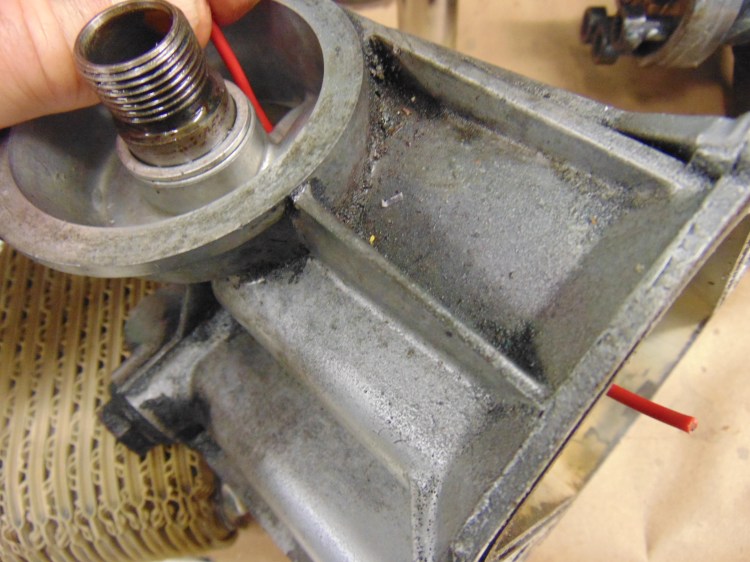 Here is the housing for the oil/water cooler. The oil from the cooler emerges in the opening where the red wire is coming out of. Interesting to note: if you want to “prime” your oil pump, you do not pour oil into the center opening where the oil filter screws on. You pour it in the opening shown with the wire.