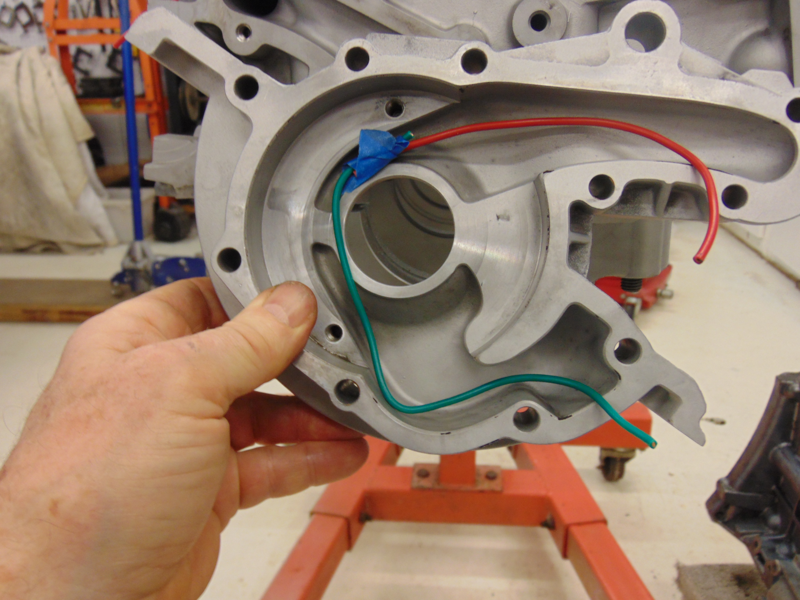 So here we are getting close to the actual oil pump. In this picture the crank girdle is loosely mounted for the photo, with a gap with respect to the block. The green wire on the lower left is emerging from the opening from the oil passageway. This is the oil suction point for the pump. The pump will eject pressurized oil at the point where the red wire starts. As we will see in the following photos of the oil pump, the oblong opening in the block is matched by the pump exit. The red wire emerging from the left side of the block is from the opening where the oil pressure relief mechanism goes.