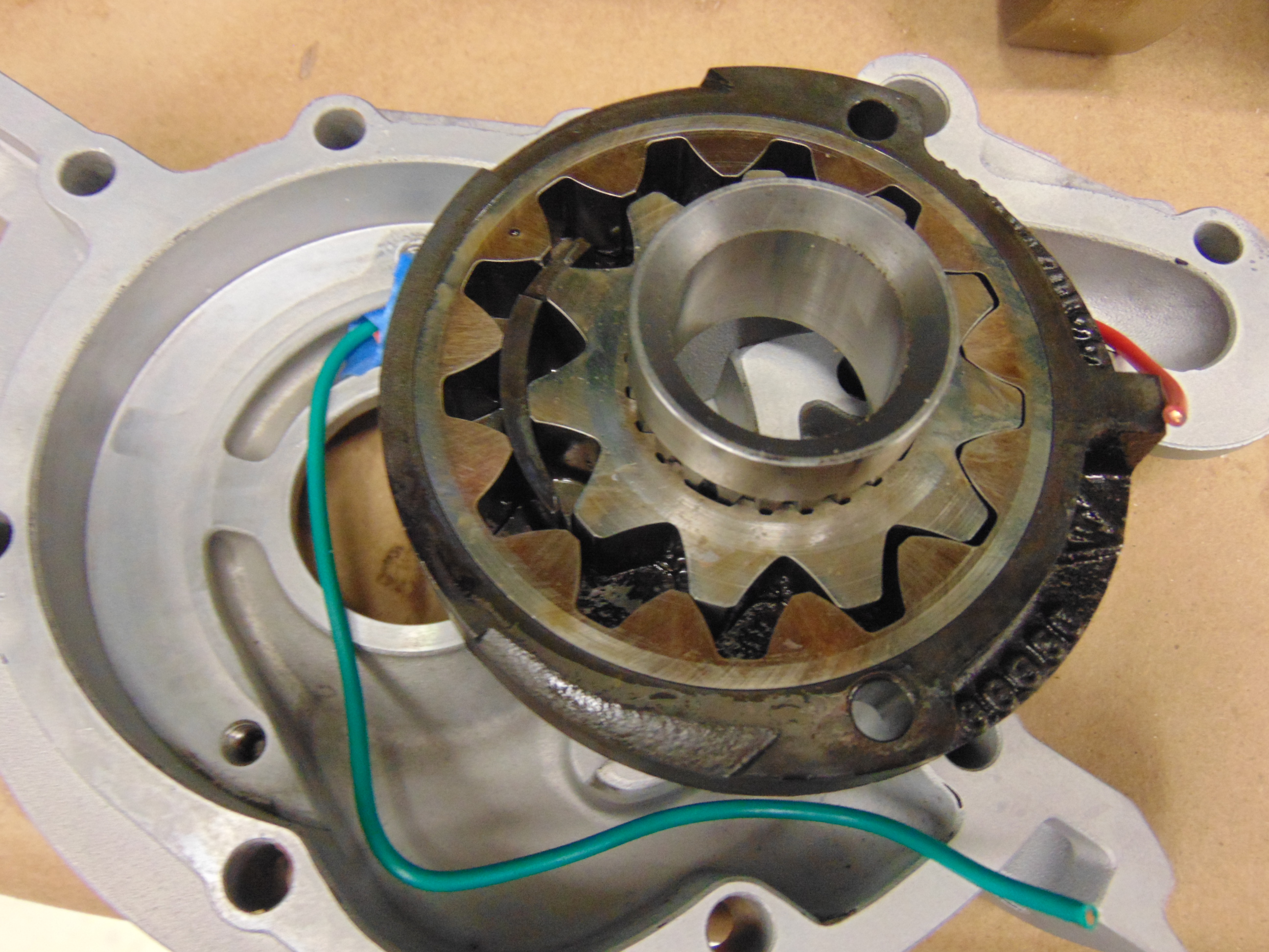 In this picture, I have simply rotated the pump to show the back side. As we will see, the important part, the impeller is removed. As noted before, the green wire is the oil in. The red wire is the oil out.