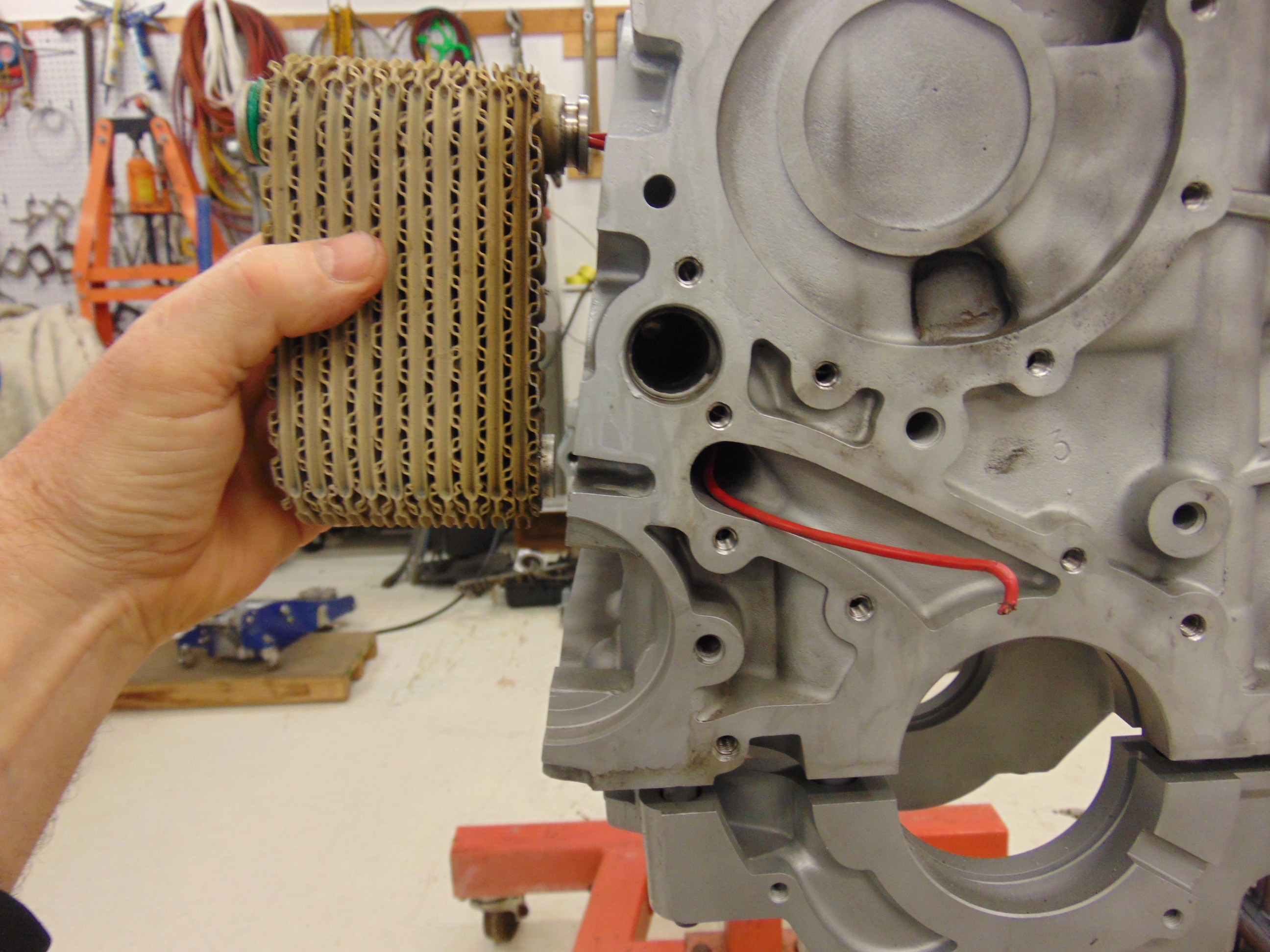 Here is the housing for the oil/water cooler. The oil from the cooler emerges in the opening where the red wire is coming out of. Interesting to note: if you want to “prime” your oil pump, you do not pour oil into the center opening where the oil filter screws on. You pour it in the opening shown with the wire.
